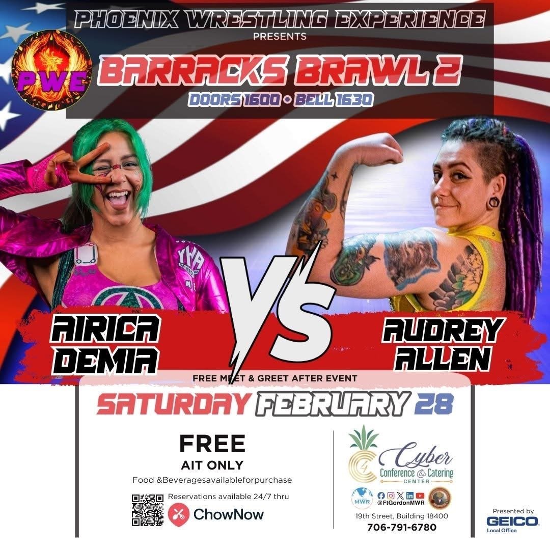 Phoenix Wrestling Experience Saturday, February 28, 2026 4:00 PM 6:30 PM Phoenix Wrestling Experience Fort Gordon Augusta, GA United States (map) Google Calendar ICS