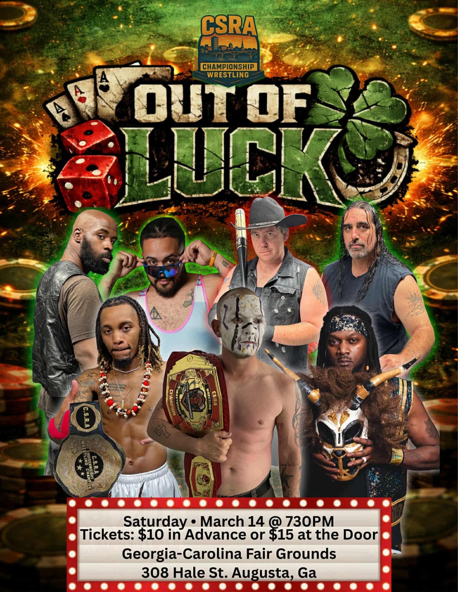 CSRA Championship Wrestling Saturday, March 14, 2026 6:00 PM 7:00 PM CSRA Championship Wrestling 308 Hale Street Augusta, GA, 30901 United States (map) Google Calendar ICS